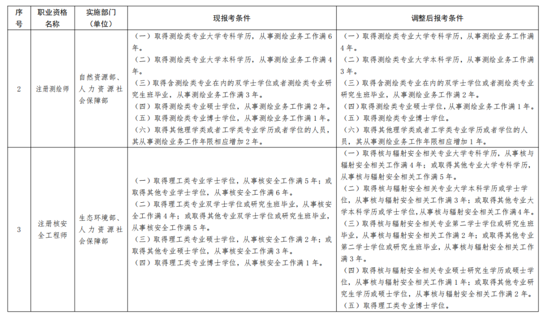 1、《部分準(zhǔn)入類職業(yè)資格考試工作年限要求調(diào)整方案》(見附件)自2022年起實(shí)施。除調(diào)整考試工作年限要求外,13項(xiàng)準(zhǔn)入類職業(yè)資格的其他考試報(bào)名條件不變。