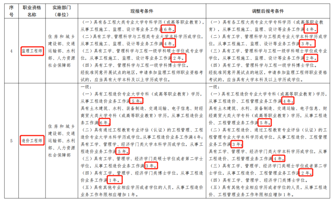 變化:取消了畢業(yè)后的總工作年限要求,除了碩士學(xué)歷外,其他學(xué)歷從事工程類工作年限不變,總體還是降低了要求的。
