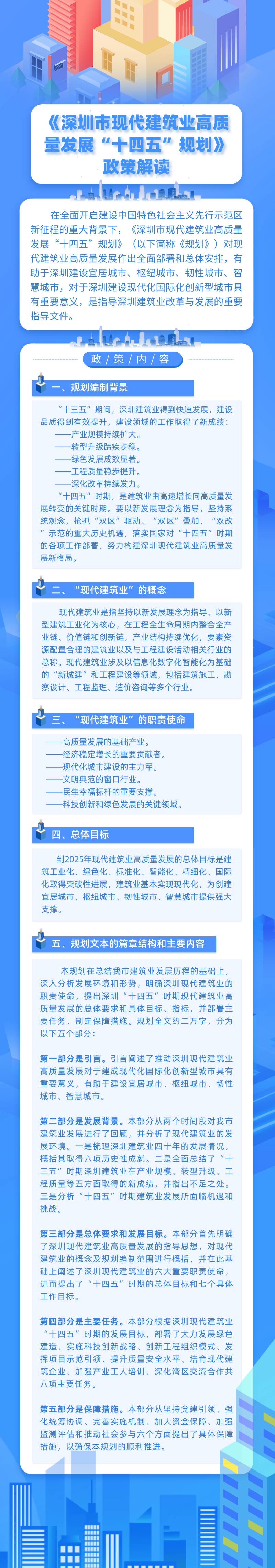 為加快推動現(xiàn)代建筑業(yè)高質(zhì)量發(fā)展,近日,深圳市住房和建設(shè)局會同市發(fā)展改革委聯(lián)合發(fā)布《深圳市現(xiàn)代建筑業(yè)高質(zhì)量發(fā)展“十四五”規(guī)劃》(以下簡稱《規(guī)劃》),就“十四五”時期深圳市現(xiàn)代建筑業(yè)職責(zé)使命、發(fā)展思路、發(fā)展目標(biāo)、主要任務(wù)作了系統(tǒng)闡述。“十四五”時期深圳市新建民用和工業(yè)建筑將全面執(zhí)行綠色建筑標(biāo)準(zhǔn),新增高星級綠色建筑不少于500個。