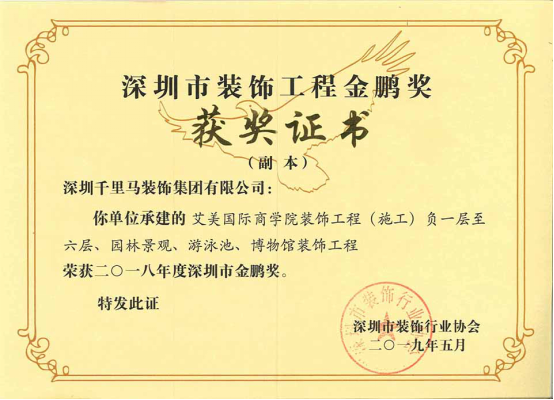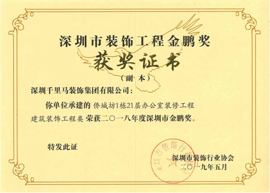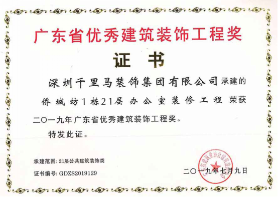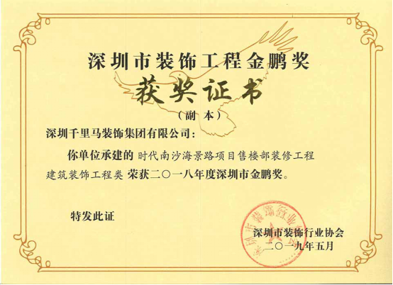 我司承建的僑城坊1棟21層辦公室裝修工程、時代南沙海景路項目售樓部裝修工程、艾美國際商學(xué)院裝飾工程三項目,經(jīng)深圳市裝飾行業(yè)協(xié)會的專家組嚴(yán)格審核,均獲得了2018年度深圳市裝飾工程“金鵬獎”。其中,僑城坊1棟21層辦公室裝修工程,經(jīng)廣東省建筑業(yè)協(xié)會組織的專家組嚴(yán)格審核,榮獲了2019年廣東省優(yōu)秀建筑裝飾工程獎。